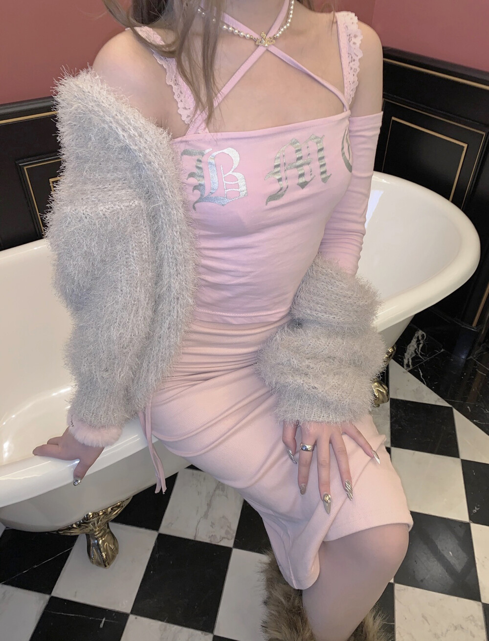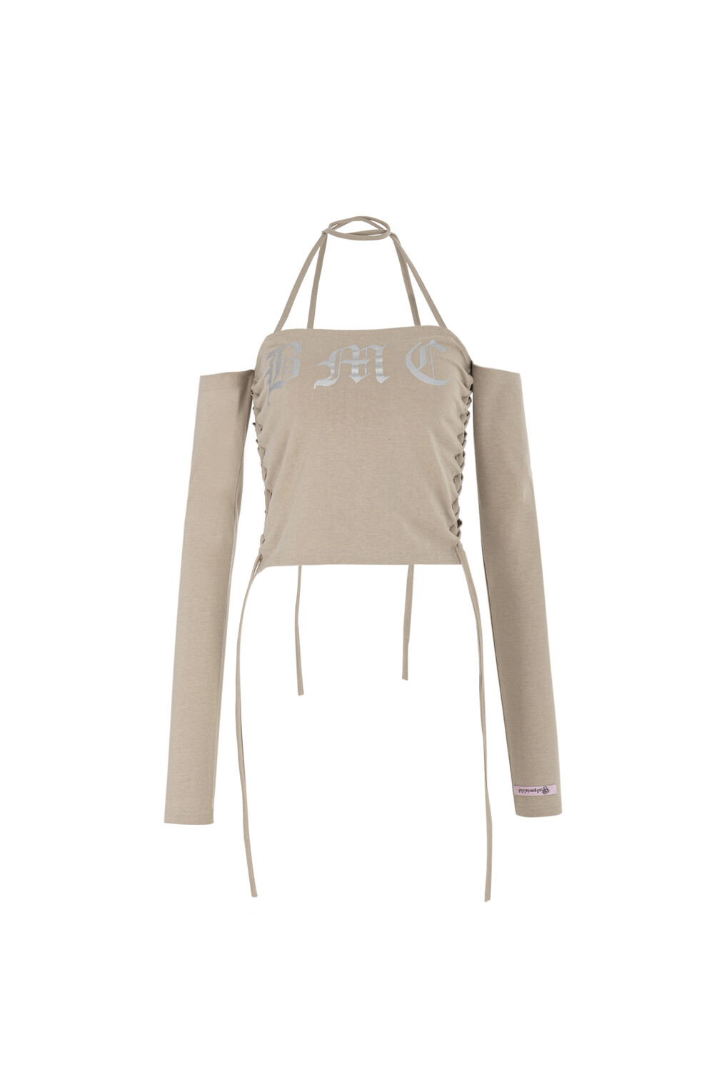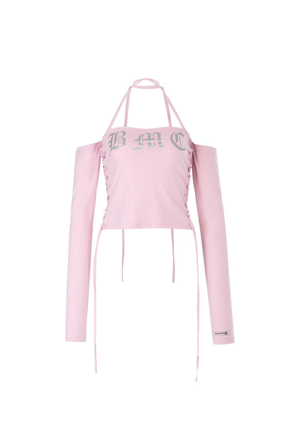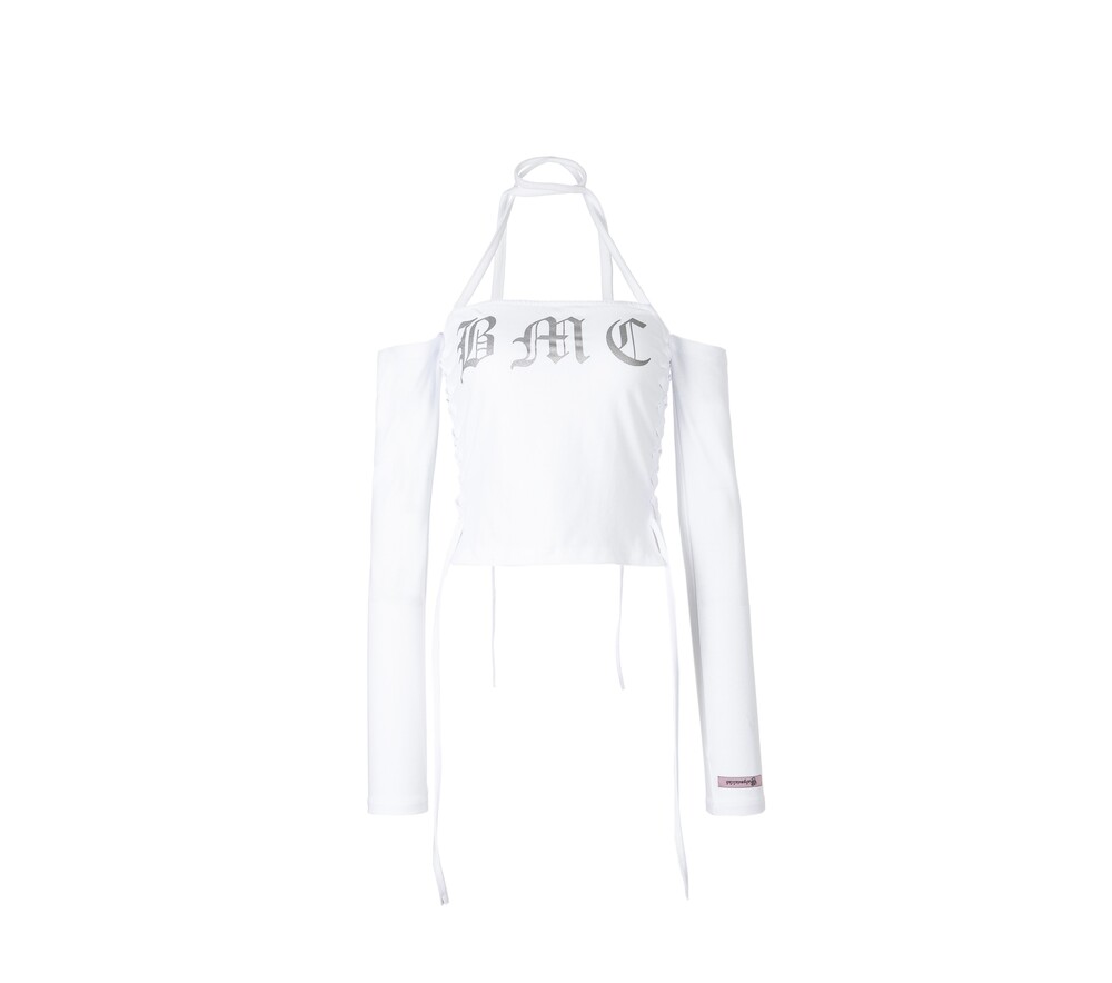실버 BMC 프린팅과 허리 옆선 로프 레이스업 디자인이 돋보이는 오프숄더 티셔츠 입니다.